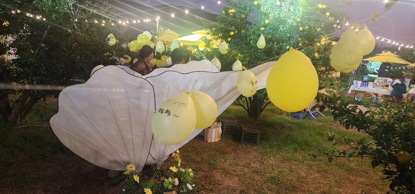 이 작품에 유자의 노란빛은 따뜻함과 희망, 그리고 삶의 활기를 표현함과 동시에 기억의 휘발성과 지속성을 동시에 다루고자 합니다. 풍선은 곧 잠시 머물다 사라지는 인간의 순간적인 감정, 그리고